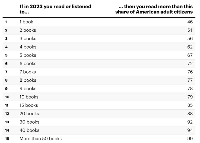 2023년 YouGov가 수집한 데이터에 따르면 연간 50권 이상의 책을 읽으면 미국 성인 중 상위 1%에 속하게 됩니다.