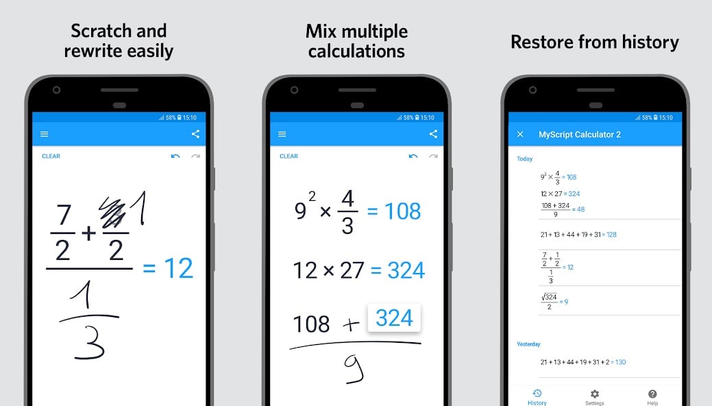 실제 종이에 하듯이 올바른 방정식을 쉽게 긁어내고 다시 쓸 수 있습니다. 방정식과 문제를 적어서 여러 줄로 확장할 수 있습니다. MyScript Calculator 2의 가장 좋은 점 중 하나는 계산을 혼합할 수 있다는 것입니다. 즉, 방정식이나 문제에 곱셈, 나눗셈, 뺄셈 등을 포함할 수 있습니다.