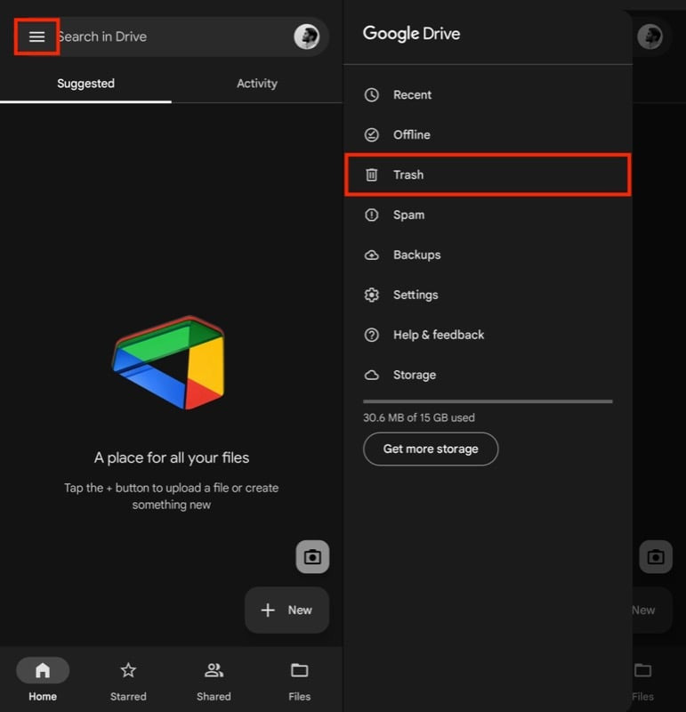 - 왼쪽 상단 모서리에 있는 햄버거 메뉴(수평선 3개)를 탭하고 휴지통을 선택하세요.