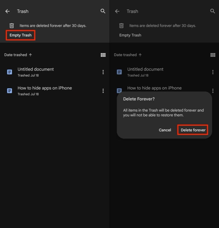 - 화면 오른쪽 상단 모서리에 있는 3개 점 메뉴를 탭하고 비우기를 선택합니다. 확인 팝업에서 삭제를 탭하여 휴지통 비우기를 확인합니다.
