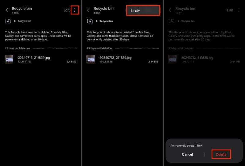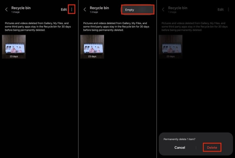 - 오른쪽 상단 모서리에 있는 3개 점 메뉴를 누르고 휴지통 비우기를 선택한 후 영구 삭제를 눌러 삭제를 확인하세요.