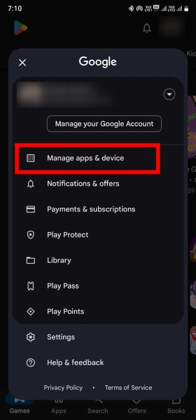 - 프로필 아이콘을 클릭하고 앱 및 기기 관리를 선택하세요 .