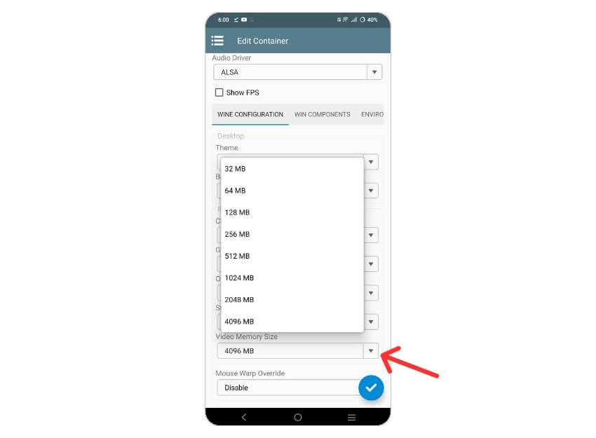 - Wine Configuration 탭에서 휴대폰의 RAM에 따라 비디오 메모리 크기를 선택합니다. 예를 들어 휴대폰의 RAM이 6GB인 경우 6144MB를 선택합니다.