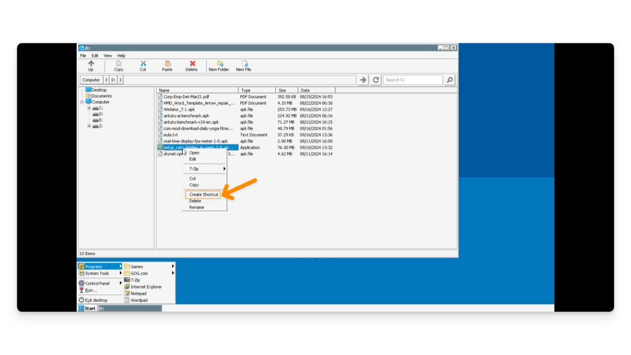 - 게임을 설치한 후에는 Winlator Container를 열고 게임 파일이 있는 위치로 이동한 다음, EXE 파일을 마우스 오른쪽 버튼으로 클릭하고 바로가기 만들기를 선택하여 바로가기를 만들 수 있습니다 .