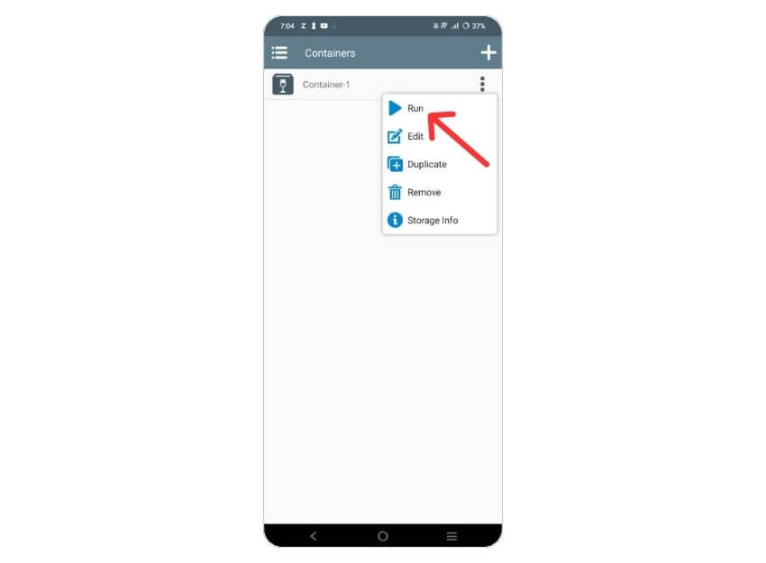 - Android 휴대폰에서 3개 점 아이콘을 누르고 실행을 선택하여 컨테이너를 시작합니다 .