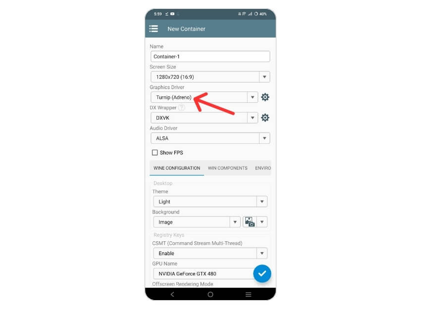 - Graphics Driver 드롭다운 메뉴 에서 장치에 Adreno GPU가 있는 경우 Turnip(Adreno)을 선택합니다 . 다른 GPU 의 경우 VirGL(Universal)을 선택해야 합니다 .