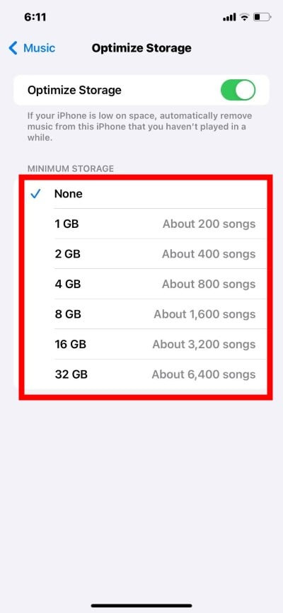 - 1GB, 2GB, 최대 32GB 까지 선택할 수 있는 여러 옵션이 표시됩니다. 또한 없음 옵션이 있는데, 선택하면 iPhone에서 다운로드한 모든 노래가 제거됩니다.