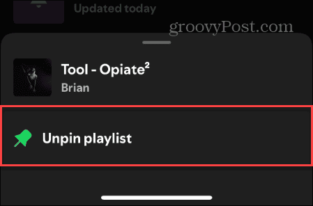 - 플레이리스트, 노래, 팟캐스트 등을 고정하면 옆에 녹색 핀 아이콘이 표시됩니다. 고정을 되돌리려면 고정된 항목을 탭하고 길게 누른 다음 메뉴에서 고정 해제 옵션을 선택합니다.