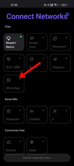 5. 네트워크 연결 화면에서 WhatsApp을 선택 하고 WhatsApp 계정을 연결하세요.