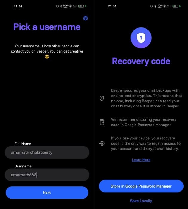 4. Beeper 앱을 열고 사용자 이름을 만들고 복구 코드를 저장합니다.