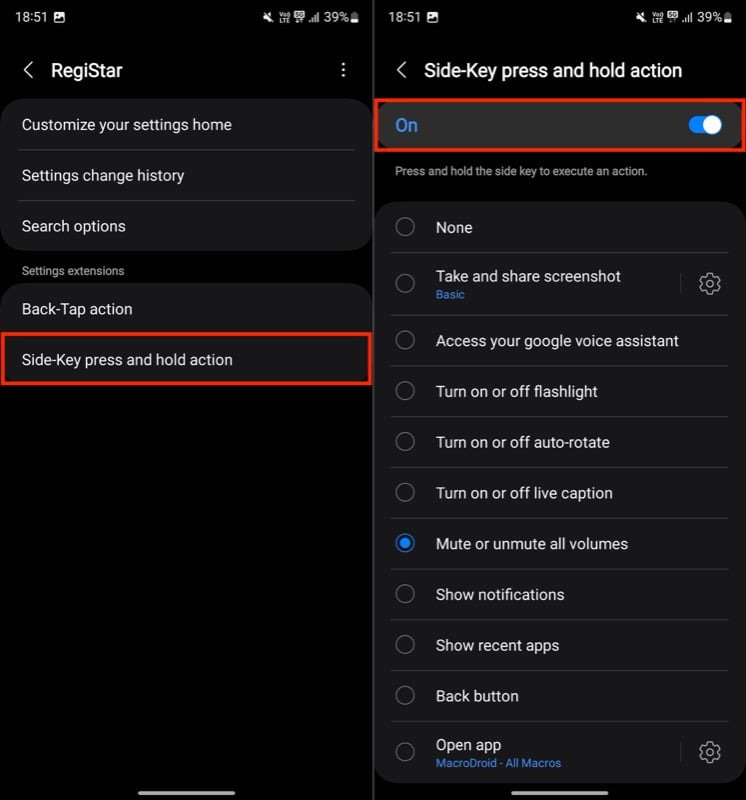 누르고 있기 동작에 더 많은 유연성을 원하시면 RegiStar Good Lock 모듈을 사용할 수 있습니다. 먼저 Galaxy Store 에서 Good Lock 앱을 설치한 다음 RegiStar 모듈을 찾아 설치합니다. 그런 다음 Good Lock 앱에서 모듈을 엽니다. 설정 확장 프로그램 에서 측면 키 누르고 있기 동작을 선택 하면 설정에서 탭하고 있기 동작에 사용할 수 없는 동작이 많이 표시됩니다. 원하는 동작 옆에 있는 라디오 버튼을 선택합니다.