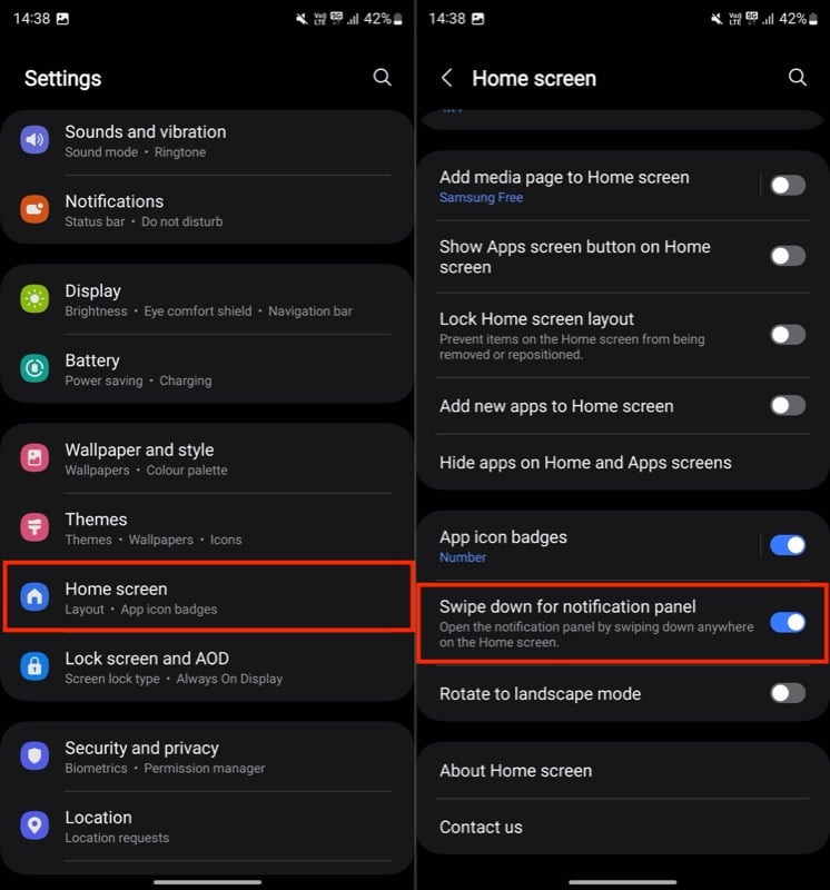 다행히도 삼성은 이를 피하고 알림 패널에 쉽게 접근할 수 있는 옵션을 제공합니다. 이를 활성화하려면 설정 > 홈 화면 으로 이동합니다. 아래로 스크롤하여 알림 패널 옵션을 켭니다.