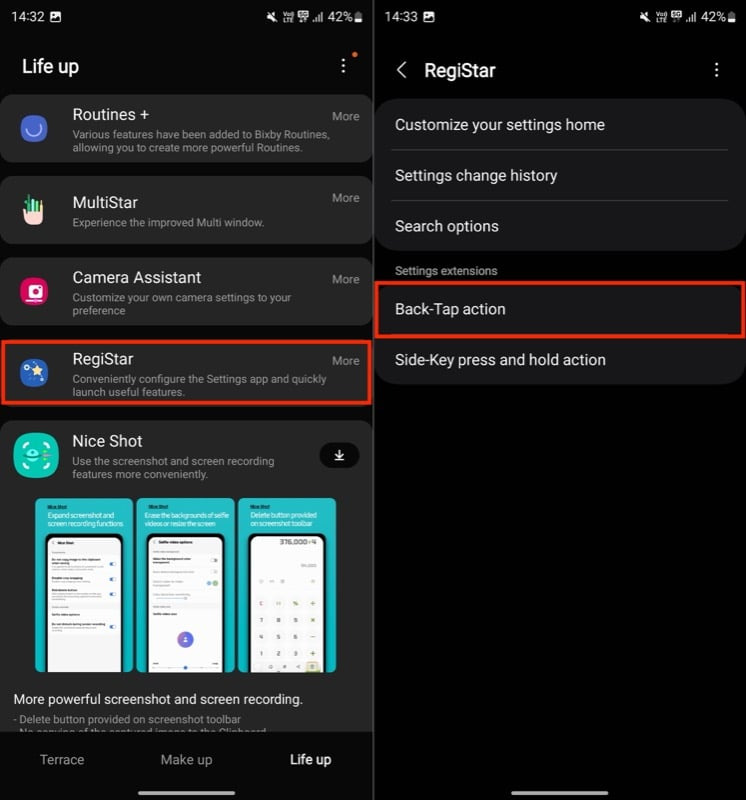 Galaxy 기기에서 Back-Tap 동작을 설정하는 것은 쉽습니다. 아직 설치하지 않았다면 Good Lock 앱 내부에 RegiStart 모듈을 설치하고 다음 단계를 따르세요.