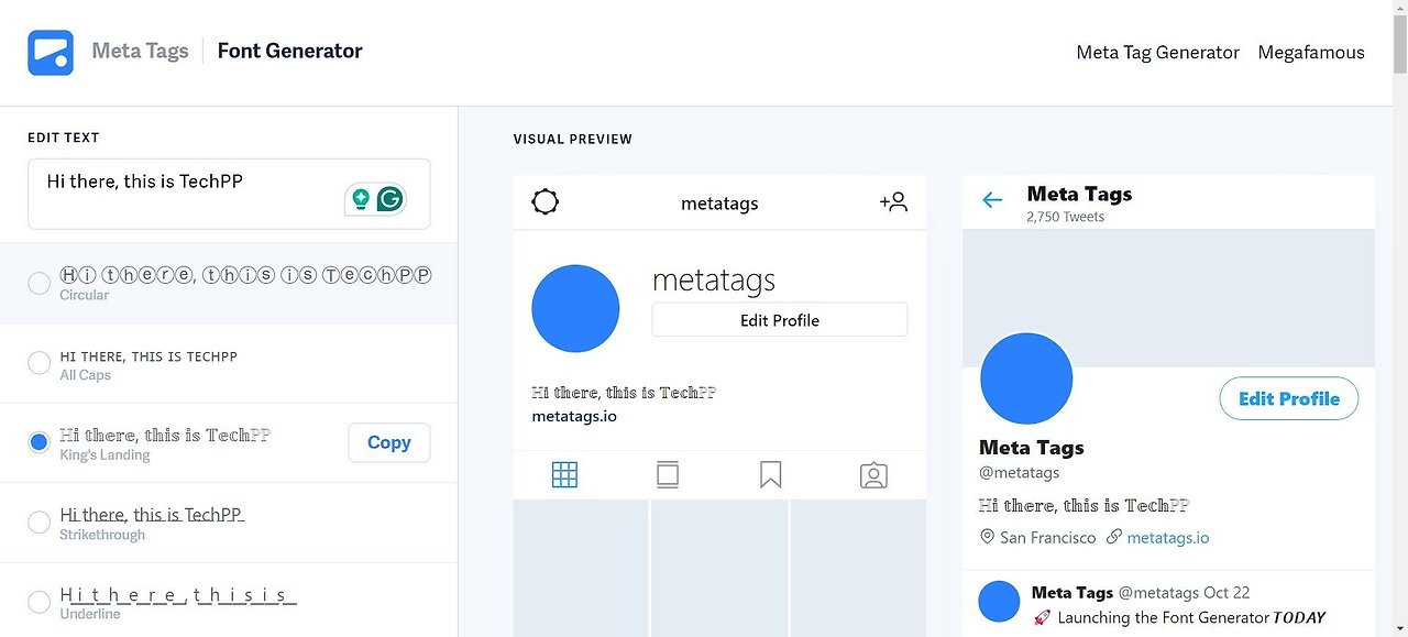 Meta Tags Font Generator는 무료로 제공되는 또 다른 인기 있는 글꼴 생성 서비스입니다. 이 웹사이트의 가장 좋은 점 중 하나는 모의 프로필에서 글꼴이 어떻게 보일지 미리 볼 수 있다는 것입니다. 다른 생성기에서는 이 기능을 사용할 수 없으며 글꼴을 복사하여 프로필에 붙여넣고 저장을 클릭하여 프로필이 라이브로 표시되면 어떻게 보일지 확인해야 합니다.