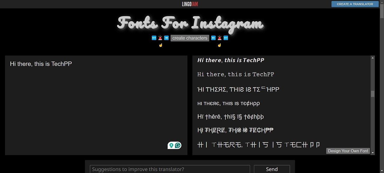 마지막으로, 최고의 인스타그램 글꼴 생성기 목록에 LingoJam의 Fonts for Instagram이라는 웹사이트가 있습니다. 이 웹사이트는 매우 간단합니다. 텍스트를 입력하면 즉시 텍스트를 다른 글꼴 스타일로 변환합니다. 생성된 글꼴을 Instagram의 아무 데나 복사하여 붙여넣을 수 있습니다.