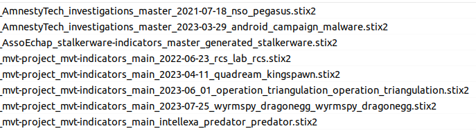 그런 다음, Indicators of Compromise(IOCs) .stix2 파일 의 백업을 확인 하고 JSON 결과를 iPhoneAnalysis 폴더에 저장합니다. 하지만 먼저 IOC 파일 목록을 다운로드합니다.
