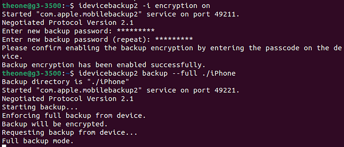 여기서 백업 비밀번호를 입력하거나 키 파일을 생성할 수 있습니다. 선택하세요. 암호화되지 않은 백업은 destination -d, iPhoneOutput 폴더에 저장됩니다. 비밀번호를 선택하면 명령줄 기록에 일반 텍스트로 저장되므로 위험합니다.
