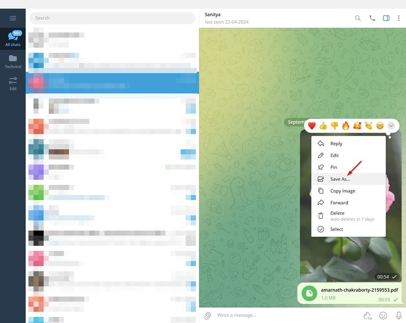 PC에서는 자동 다운로드나 갤러리에 저장 기능이 없습니다. 텔레그램 데스크톱에서 파일을 다운로드하는 유일한 방법은 수동으로 저장하는 것입니다. 방법은 다음과 같습니다.