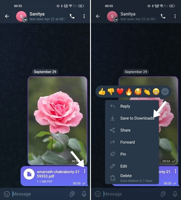 PDF, TXT, DOC 등의 다른 파일 유형은 내부 저장소 > 다운로드 > Telegram 폴더에 저장됩니다. 휴대폰의 파일 탐색기나 Google 파일 앱에서 이 폴더에 액세스할 수 있습니다.