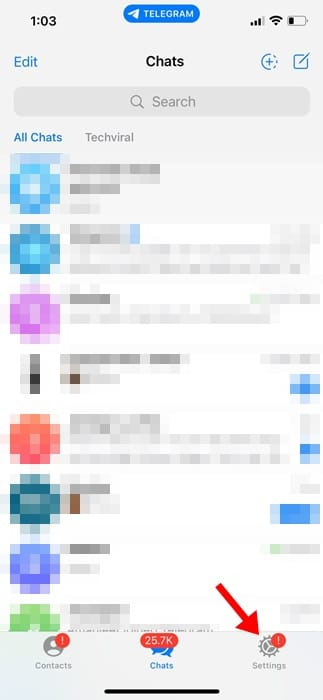 1. 아이폰에서 Telegram 앱을 실행합니다. 다음으로, 화면 하단의 설정을 탭합니다.