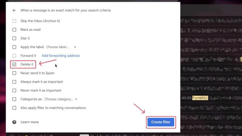 또한, 이메일을 보기 전에 삭제하기 위한 필터를 만들 수도 있습니다. 수신 이메일을 삭제하기 위한 필터를 만드는 과정은 위에서 언급한 이메일 보관과 동일합니다. 유일한 변경 사항은 마지막 단계에서 받은 편지함 건너뛰기(보관) 대신 삭제를 선택하는 것입니다.