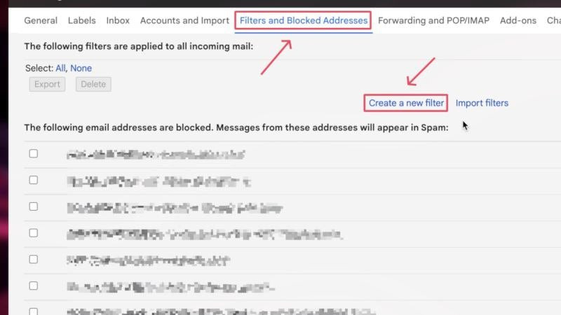 - 위쪽 창에서 필터 및 차단된 주소 로 전환 하고 새 필터 만들기를 선택하세요.
