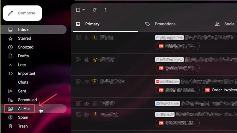 - 아래로 스크롤하여 모든 메일을 선택합니다. 받은 편지함에 있는 다른 모든 이메일과 함께 보관된 이메일을 찾을 수 있습니다.
