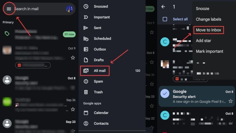 - 이메일의 보관을 취소하려면 해당 이메일을 길게 누른 후 오른쪽 상단에 있는 케밥 메뉴 아이콘(⁝) 을 클릭하세요 .