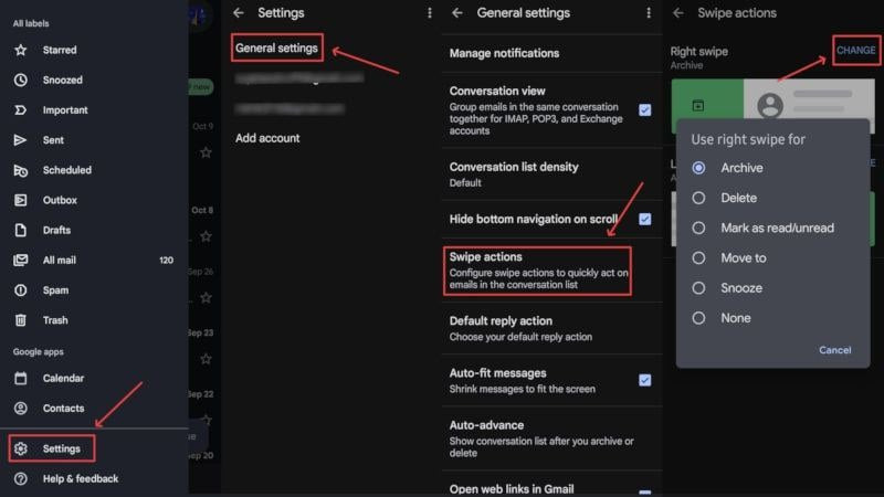 손가락으로 스와이프하여 이메일을 삭제하도록 스와이프 기능을 설정할 수도 있습니다. Gmail 모바일 앱에서 스와이프 동작을 설정하는 방법은 다음과 같습니다.