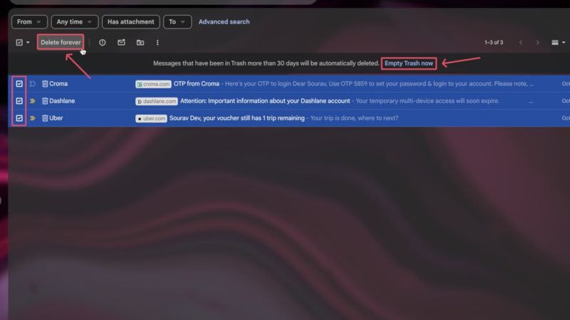 - 선택한 이메일을 삭제하려면 상단의 툴바에서 영구 삭제를 선택합니다. 또는 지금 휴지통 비우기 옵션을 클릭하여 휴지통을 즉시 비울 수 있습니다.
