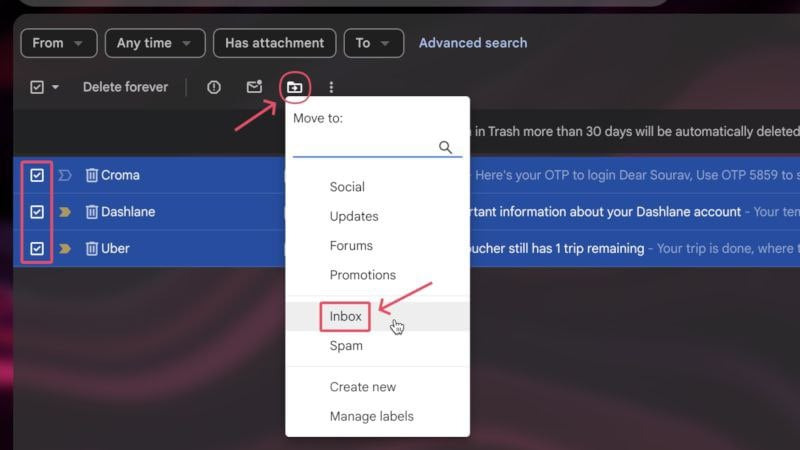- 아래에 표시된 대로 보관 취소하려는 이메일 옆에 있는 확인란을 선택 하고 받은 편지함으로 이동 옵션을 클릭하세요.