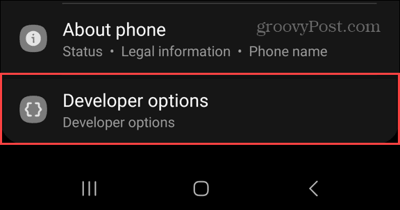 - 설정을 열고 화면을 아래로 스크롤한 다음 개발자 옵션을 탭합니다 (휴대전화 정보 옵션 아래에 표시됨).