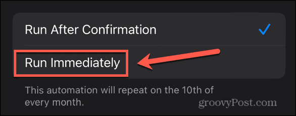 - 화면 하단에서 '즉시 실행'을 선택하세요. 그렇지 않으면 적절한 시간이 되면 자동화를 실행할지 확인해야 합니다.