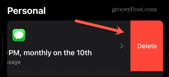 - 메시지가 전송되면 자동화를 삭제해야 합니다. 그렇지 않으면 나머지 기간 동안 매달 같은 메시지를 계속 전송합니다. 바로가기에서 자동화 탭으로 돌아가서 자동화를 왼쪽으로 스와이프합니다.