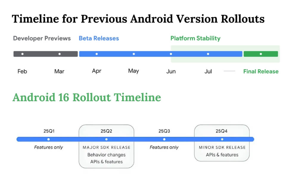 Google에서 공유한 타임라인에 따르면, 2025년에는 두 가지 주요 SDK 릴리스가 있을 예정입니다. 첫 번째 주요 릴리스는 2025년 2분기에 있을 예정이며, 안드로이드 16 업데이트가 될 것으로 예상됩니다. 이후 2025년 4분기에 또 다른 마이너 SDK 릴리스가 있을 예정이며, 마이너 업그레이드, 최적화 및 버그 수정이 포함된 Android 16 업데이트가 될 것으로 예상됩니다.