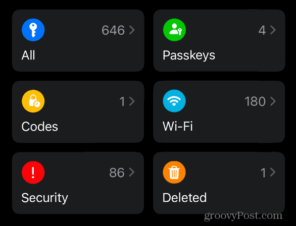 앱 은 최근 삭제된 비밀번호를 삭제됨 섹션에 저장합니다. 사진 앱과 마찬가지로 삭제된 비밀번호는 삭제되기 전 30일 동안 iPhone에 보관됩니다. 메인 화면 하단에는 공유 그룹 섹션도 있습니다. 이 섹션을 사용하여 가족 구성원과 같이 비밀번호를 공유하는 사람들의 그룹을 만들 수 있습니다.