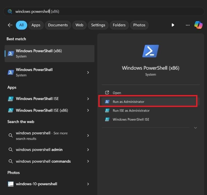 - Windows PowerShell을 입력 하고 관리자 권한으로 엽니다.