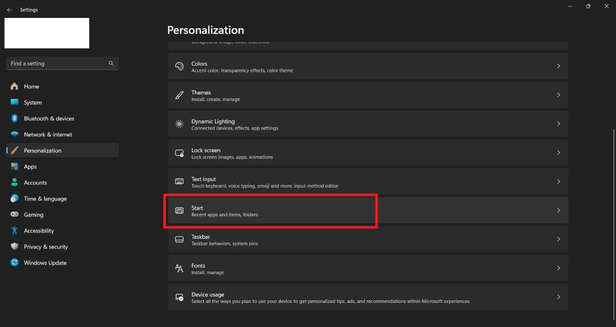 - 시작 메뉴 설정에서 권장 섹션 제거를 두 번 클릭합니다.