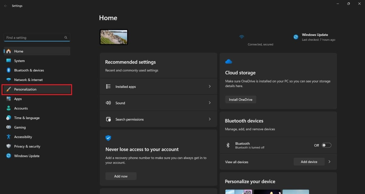 - 왼쪽 창에서 개인 설정을 선택합니다.