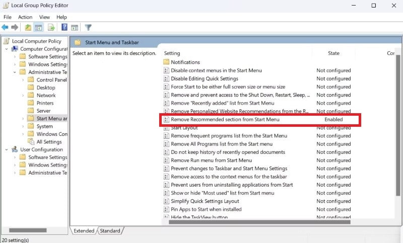 - 이 경로로 이동합니다: 컴퓨터 구성 > 관리 템플릿 > 시작 메뉴 및 작업 표시줄.