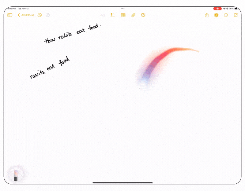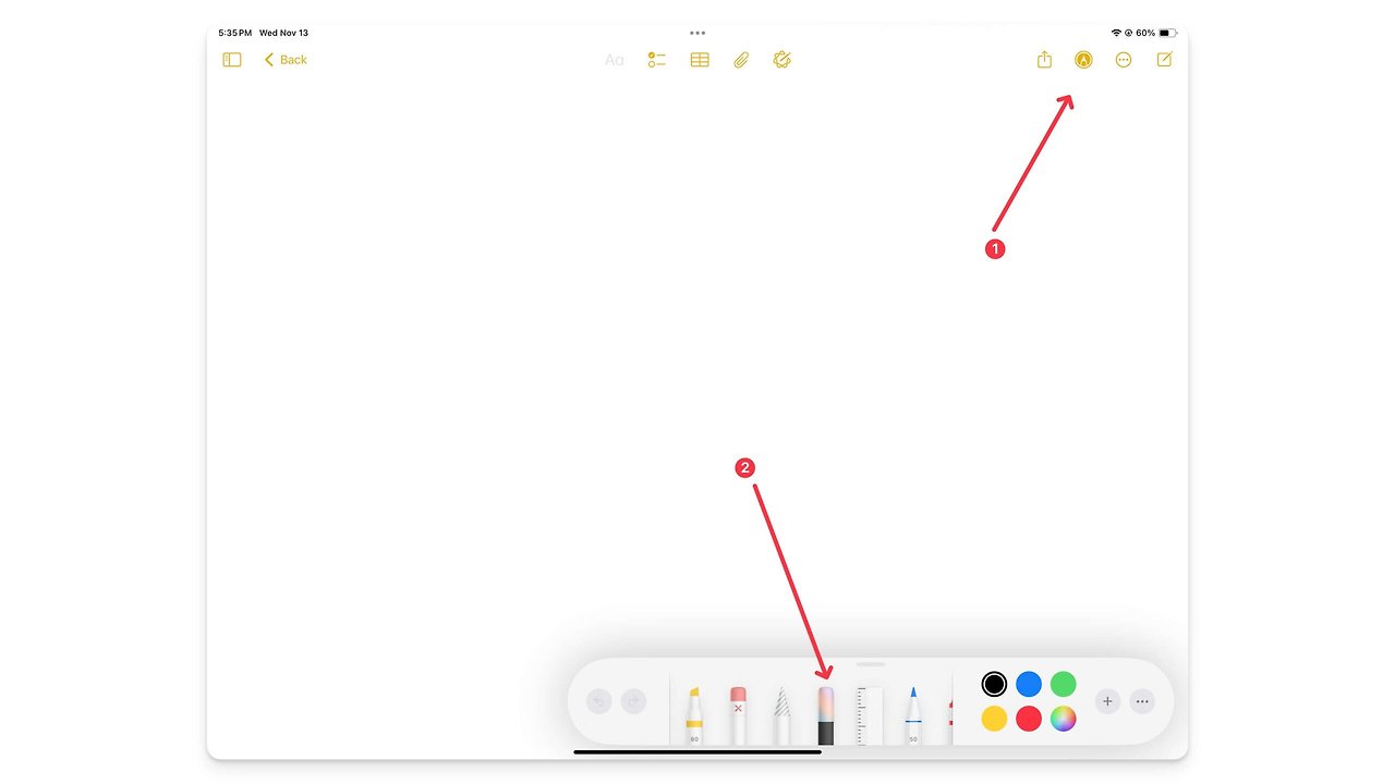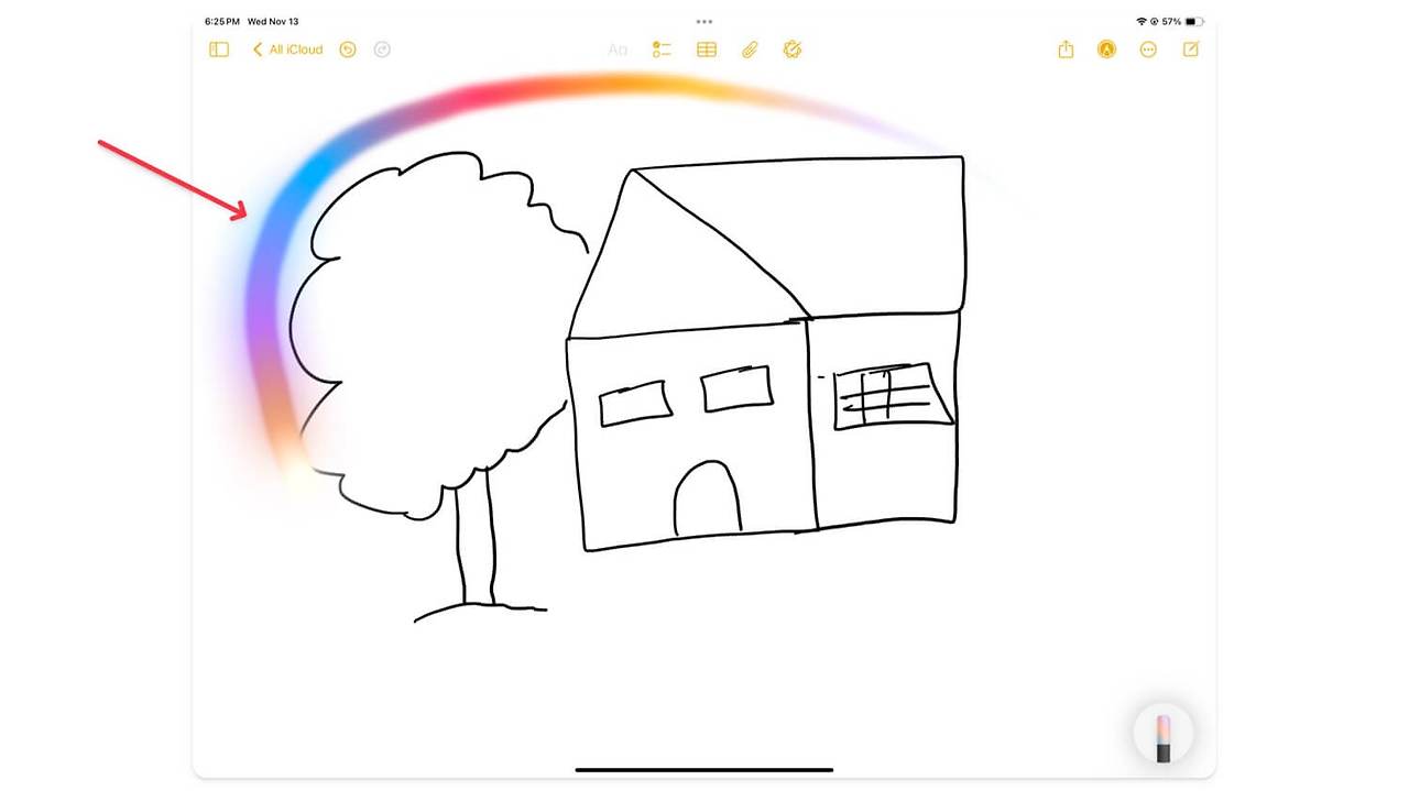 - 아이패드에서 상단의 연필 아이콘을 클릭하여 툴바를 열고 연필 위에 있는 마법 지우개처럼 보이는 새로운 무지개색 연필을 클릭합니다. 이것이 보이지 않으면 Image Wand가 장치에서 지원되지 않거나 활성화되지 않은 것입니다. 이전 단계에 따라 활성화하세요.