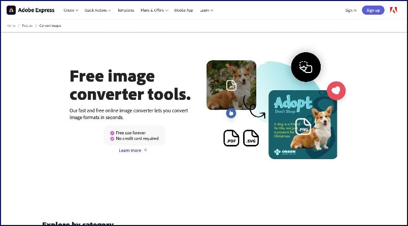 이미지를 여러 형식으로 변환할 수 있는 Adobe 무료 이미지 변환 도구입니다. 그러나 이 가이드의 다른 도구와 비교할 수 없을 만큼 품질이 좋습니다. 현재 이 도구를 사용하면 이미지를 JPG, PNG, SVG, PDF 등으로 변환할 수 있습니다. 그러나 이러한 도구는 개별적으로 액세스할 수 있습니다.