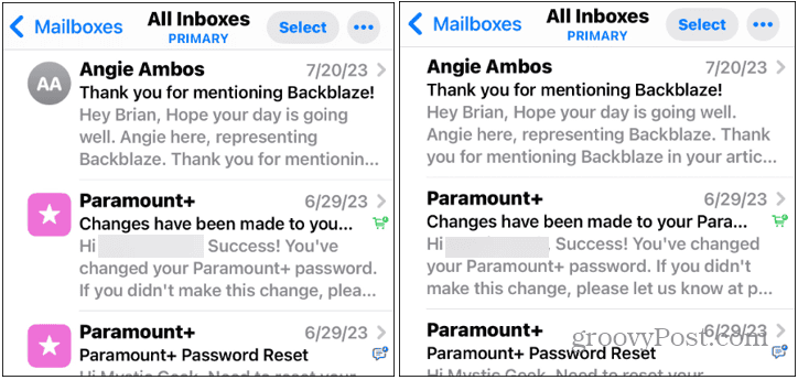 그게 전부입니다. 메일 앱으로 가면 프로필 아이콘이 사라져서 이메일을 보고 데이터를 미리 보는 것이 더 쉬워졌습니다. 왼쪽에는 아이콘이 활성화되어 있고 오른쪽에는 활성화되어 있지 않은 예가 있습니다. 이 스크린샷은 페이지 상단에서 찍은 것이지만, 아이폰에서 메일 앱이 완전히 표시되면 차이가 보입니다.