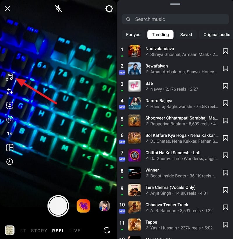 그런 다음, 순위와 함께 더 많은 트렌딩 트랙을 찾으려면 트렌딩 버튼을 탭합니다. 트렌딩 오디오 트랙 50개와 해당 오디오로 만든 릴 수가 나열됩니다.