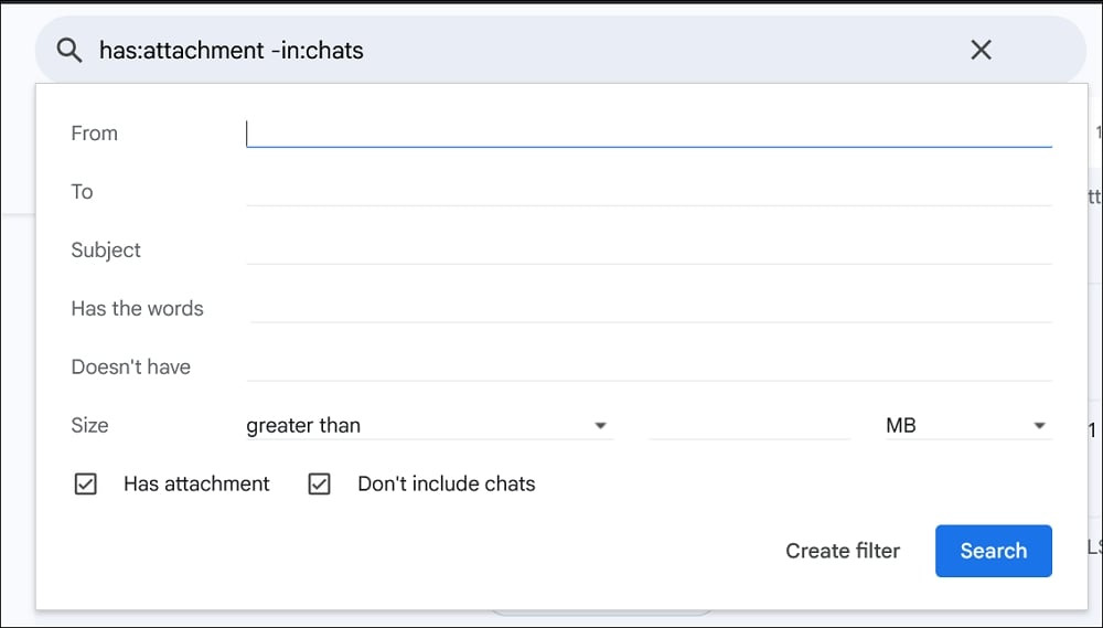 '포함' 단어, '포함하지 않음', '크기' 등의 필터를 사용하여 누락된 이메일을 찾으세요.