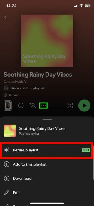 - Spotify가 더 나은 서비스를 제공할 수 있다고 생각되면, 세 개의 점 메뉴를 클릭 하고 재생 목록 구체화 옵션을 선택하세요.