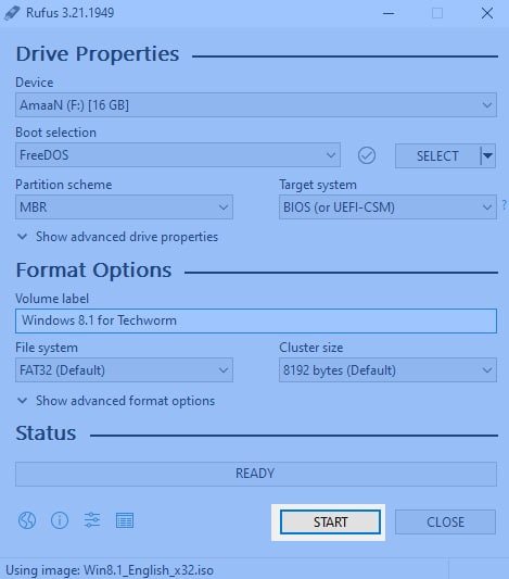 무료 부팅 가능 파일 생성 도구인 Rufus를 사용하여 부팅 가능한 Windows 8.1을 만들겠습니다. 방법은 다음과 같습니다.