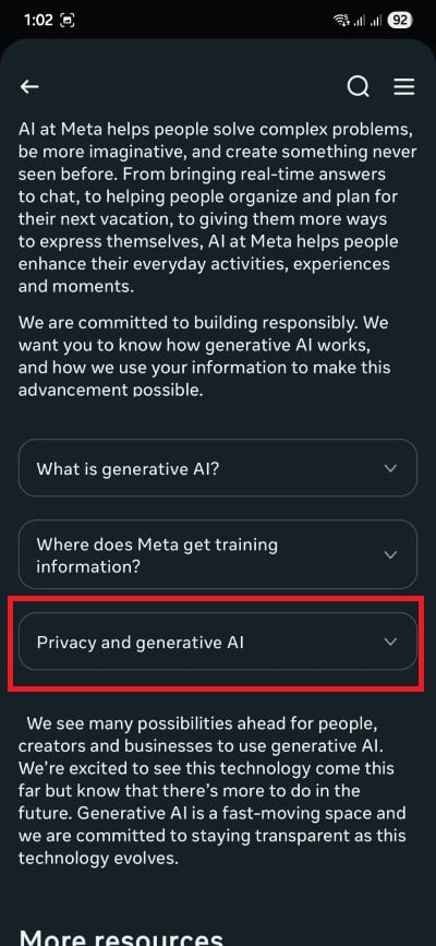 - 아래로 스크롤하여 추가 리소스 아래에서 Meta가 생성 AI 모델에 정보를 사용하는 방법을 탭합니다.