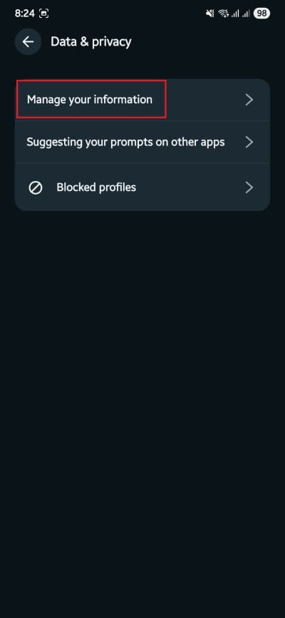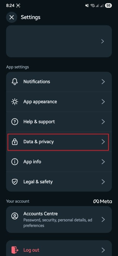 - 앱 설정 에서 데이터 및 개인정보 보호 로 이동합니다.