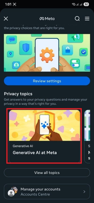 - 개인정보 보호 주제 에서 Meta의 Generative AI를 선택하세요.